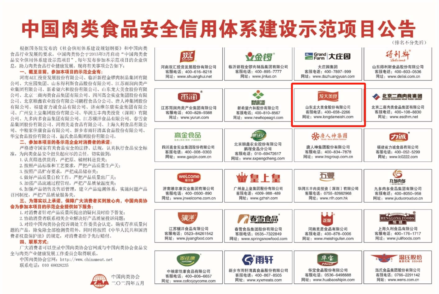 龍大美食再次入選“中國肉類食品安全信用體系建設(shè)示范項(xiàng)目”